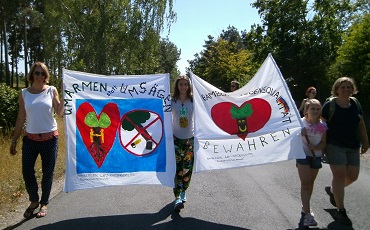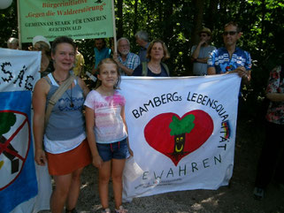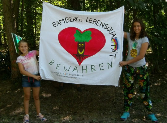 Für die Kids der Bamberger Kinder-/Jugendgruppe „Fuchsenwiesenbande“ war es etwas wirklich spannendes und neues, uns so intensiv mit einem Naturschutzthema zu beschäftigen, dass wir absolut überzeugt und mit großem Engagement, mit der Unterstützung der ganzen Familie, mit einem politischen Anliegen Flagge in der Öffentlichkeit zeigten. Nach unserem gelungenen Auftritt mit einem Aktionsstand in der Bamberger Fußgängerzone im Jahr davor, war das Ziel all unserer Bemühungen, als Bamberger Naturschutz-Kindergruppe mit selbst gestalteten Bannern an der groß angelegten Demo zur Rettung des Hauptsmoorwaldes teilzunehmen. Hierzu wurde bis auf den letzten Drücker resp. Pinsel- bzw. Bügelstrich wirklich unserer kreativen Konsensfindung bishin zum geduldigen großformatigen Gestalten alles abverlangt. Das Ergebnis war gigantisch, überzeugend und transportierte unsere Message klar und deutlich: Ein breit lächelnder gesunder Baum forderte „Bambergs Lebensqualität bewahren“ und „Umarmen statt Umsägen“ wurde ebenso durch klare Bildsprache verdeutlicht. Stolz wurden diese Aushängeschilder der Öffentlichkeit bei der eindrucksvollen Demo durch den Hauptsmoorwald präsentiert und letztendlich wurde ja auch durch die Summe all der vielen Bemühungen das gemeinsame Zeil erreicht: der Bebauungsplan der Stadt wurde im Rahmen eines tollen Ergebnisses beim Bürgerbegehren gestoppt und damit ein klares richtungsweisendes Signal an die Stadtspitze gesendet. Hurra!!!!