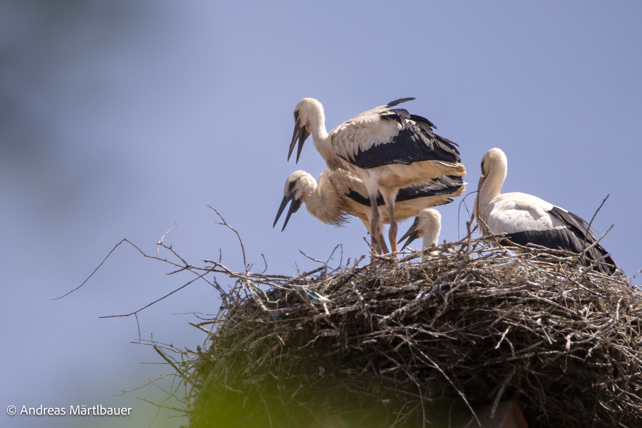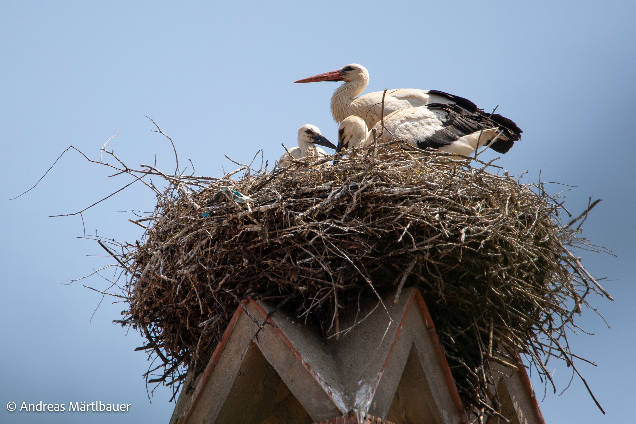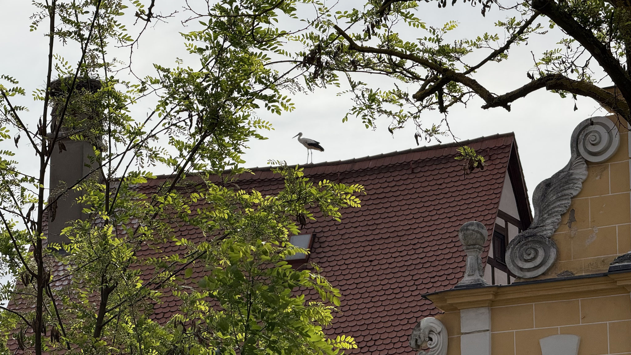 "Auch dieses Jahr haben die Domgrundstörche (zum bereits vierten Mal!) den Horst auf dem Hotel Martin, einem adeligen Stadthaus mit schmucker Dientzenhoferfassade neben dem Alten Ebracher Hof, welches das Barockhotel beherbergt, zu ihrem Brutplatz auserkoren. Bis vor kurzem bin ich als auch die Anwohner von einem zweiköpfigen Nachwuchs ausgegangen. Meine längere Beobachtung vom 13. Juni bestätigt allerdings ein Jungstorchentrio. Der zweite Altvogel tauchte an diesem Tag leider nicht auf.", Andreas Märtlbauer.