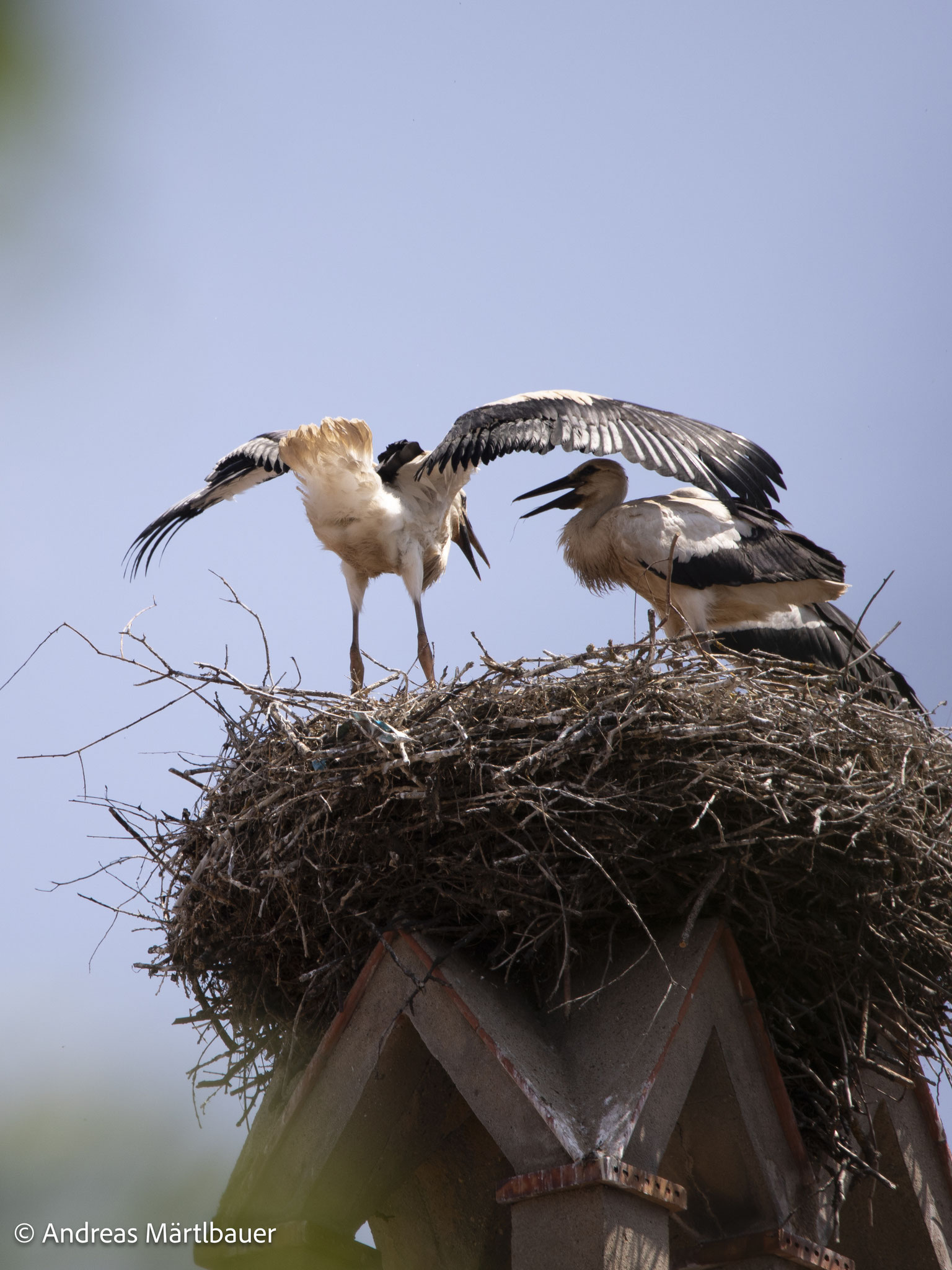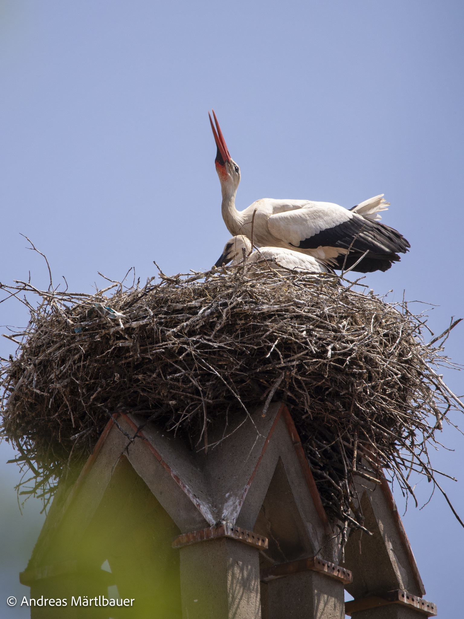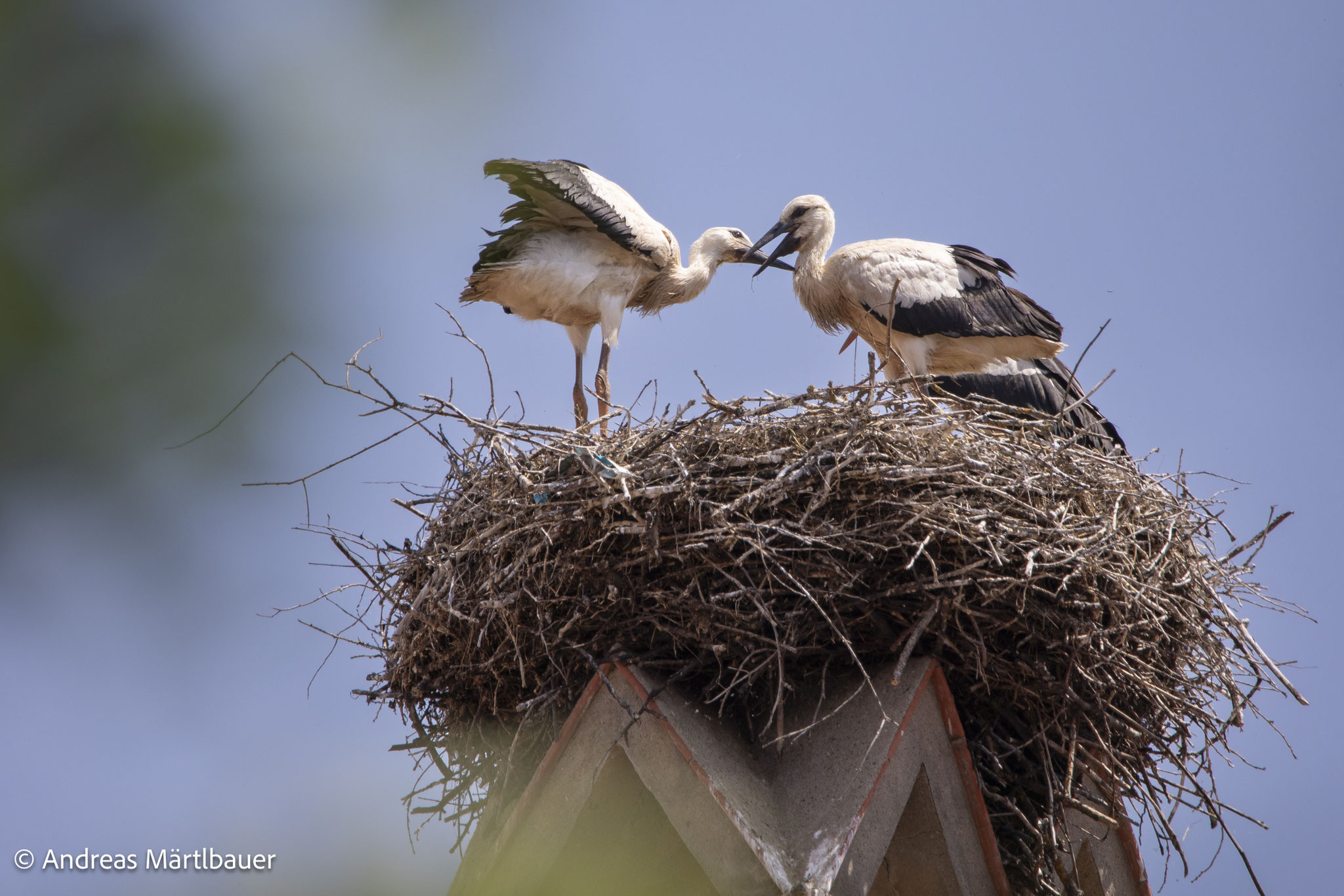"Auch dieses Jahr haben die Domgrundstörche (zum bereits vierten Mal!) den Horst auf dem Hotel Martin, einem adeligen Stadthaus mit schmucker Dientzenhoferfassade neben dem Alten Ebracher Hof, welches das Barockhotel beherbergt, zu ihrem Brutplatz auserkoren. Bis vor kurzem bin ich als auch die Anwohner von einem zweiköpfigen Nachwuchs ausgegangen. Meine längere Beobachtung vom 13. Juni bestätigt allerdings ein Jungstorchentrio. Der zweite Altvogel tauchte an diesem Tag leider nicht auf.", Andreas Märtlbauer.