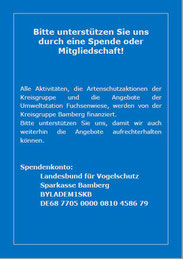 Habt ihr allgemeine Wünsche, Fragen, Anregungen oder benötigt Hilfe beim Vogel- und Naturschutz? Schreibt uns einfach eine e-mail an bamberg@lbv.de oder nutzt den Menüpunkt Kontakt!
